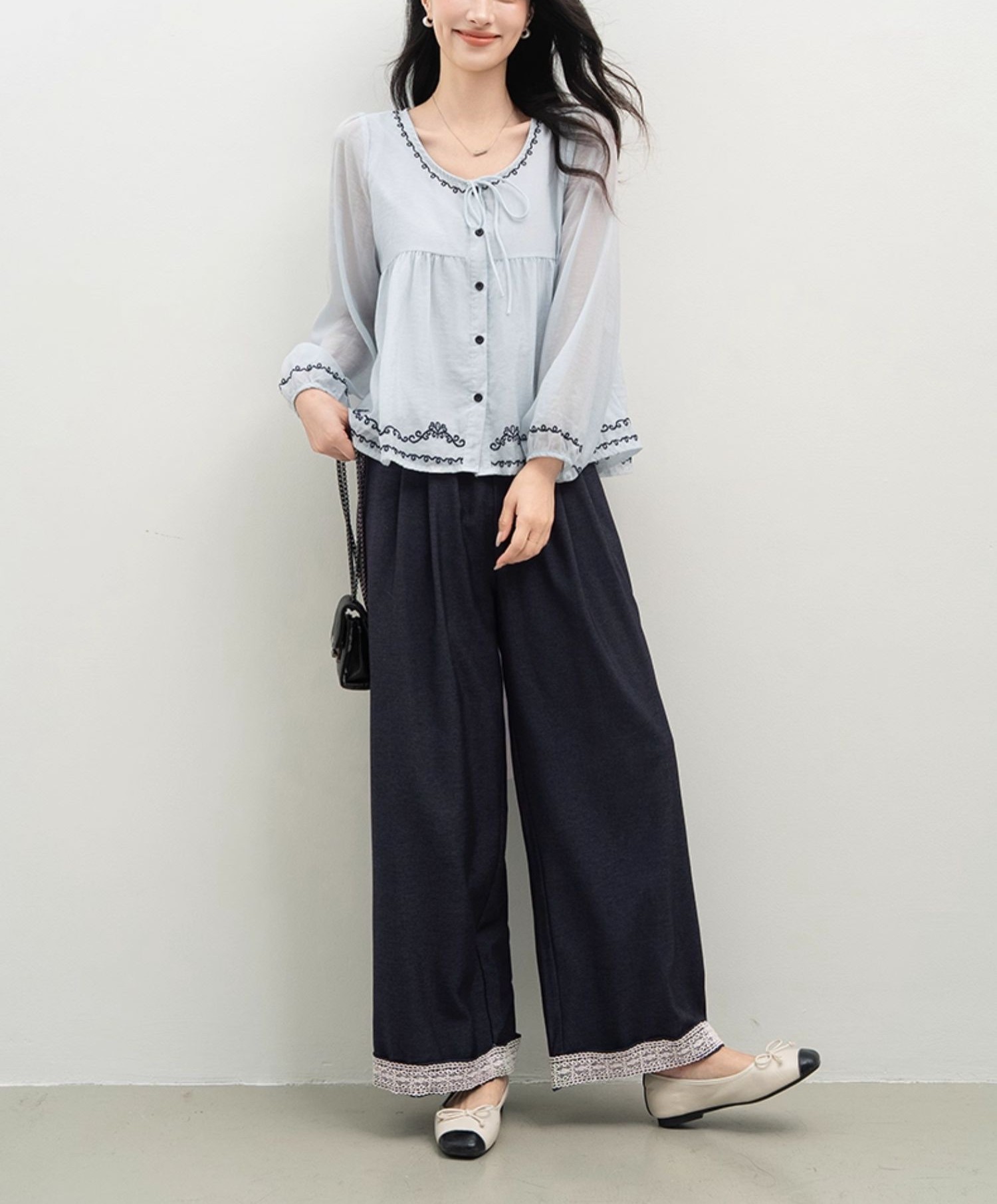夏梵尼心动信号蓝色衬衫女2025秋新款长袖刺绣系带小衫娃娃衫上衣