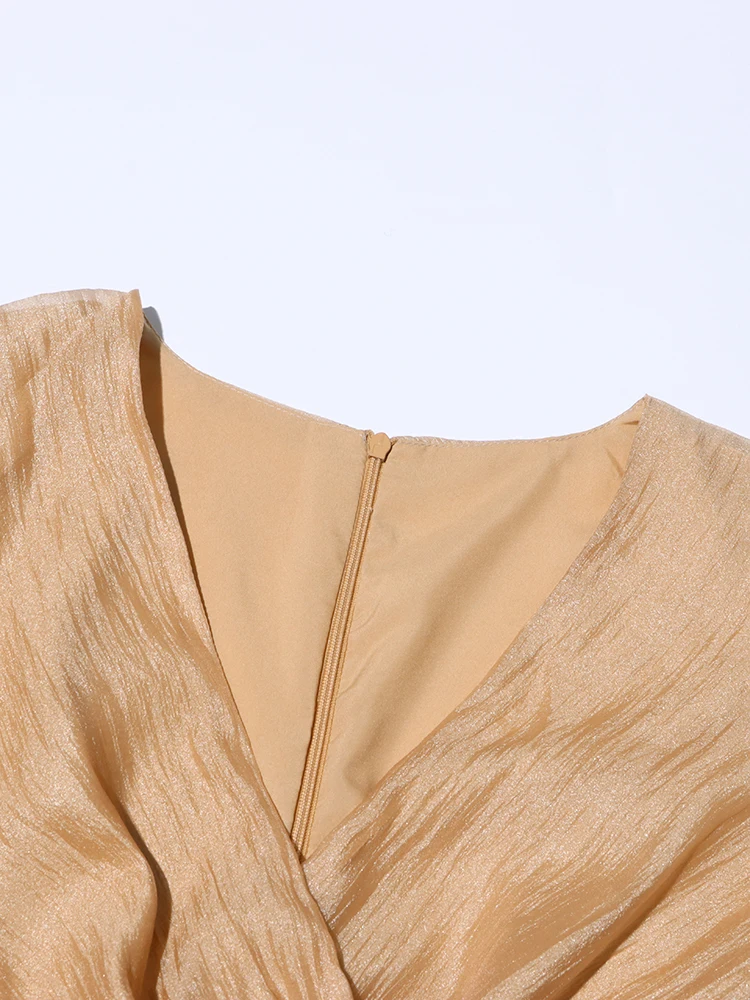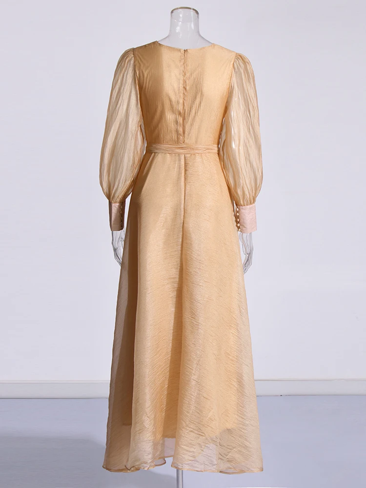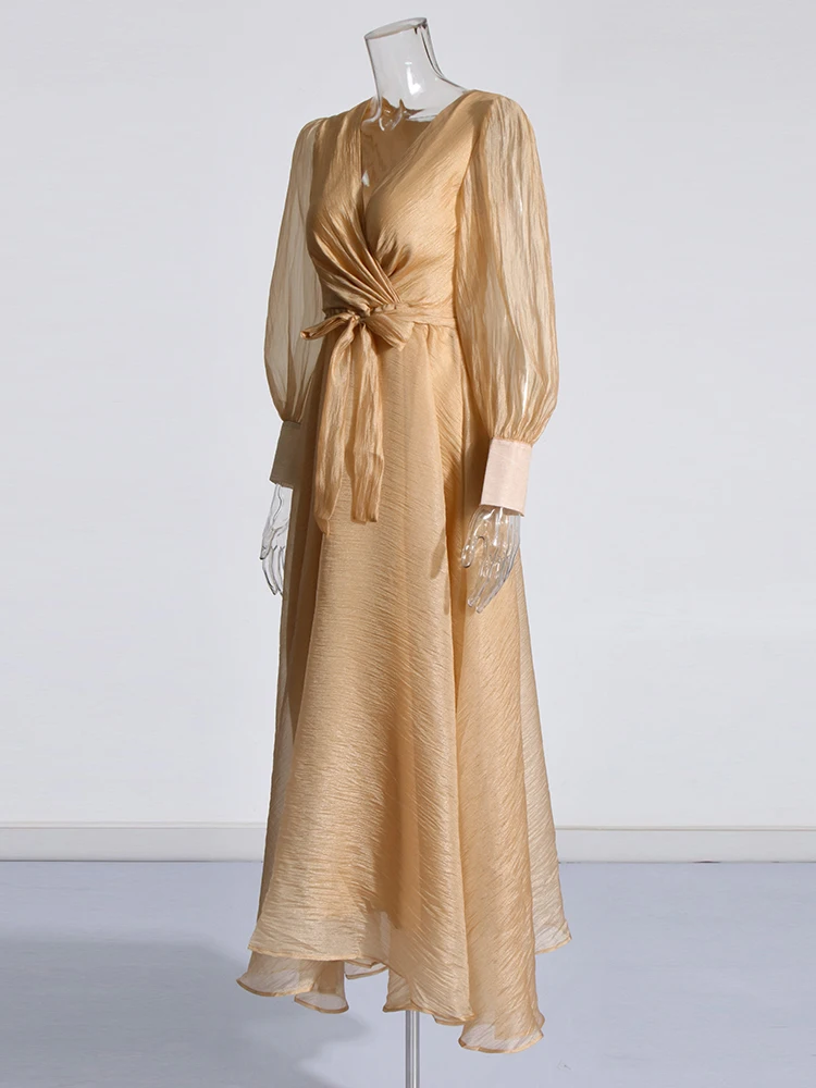Solid Spliced Lace Up Elegant Dresses For Women V Neck Lantern Sleeve High Waist Patchwork Zipper Long Dress Female Fashion