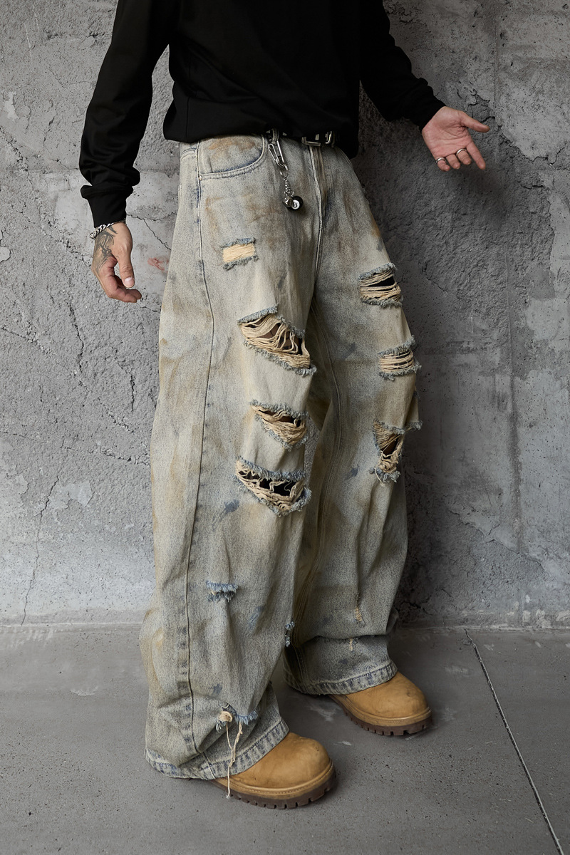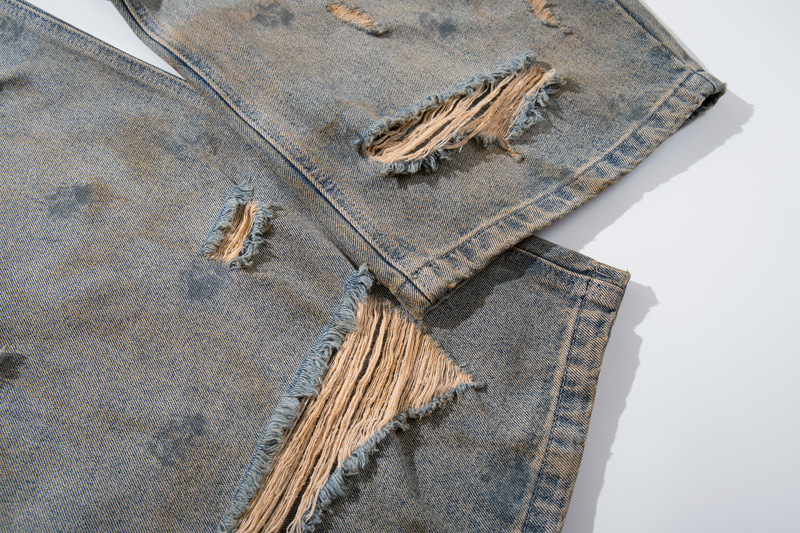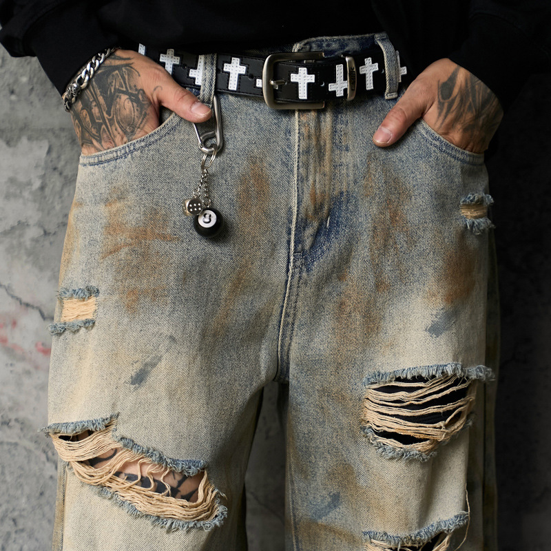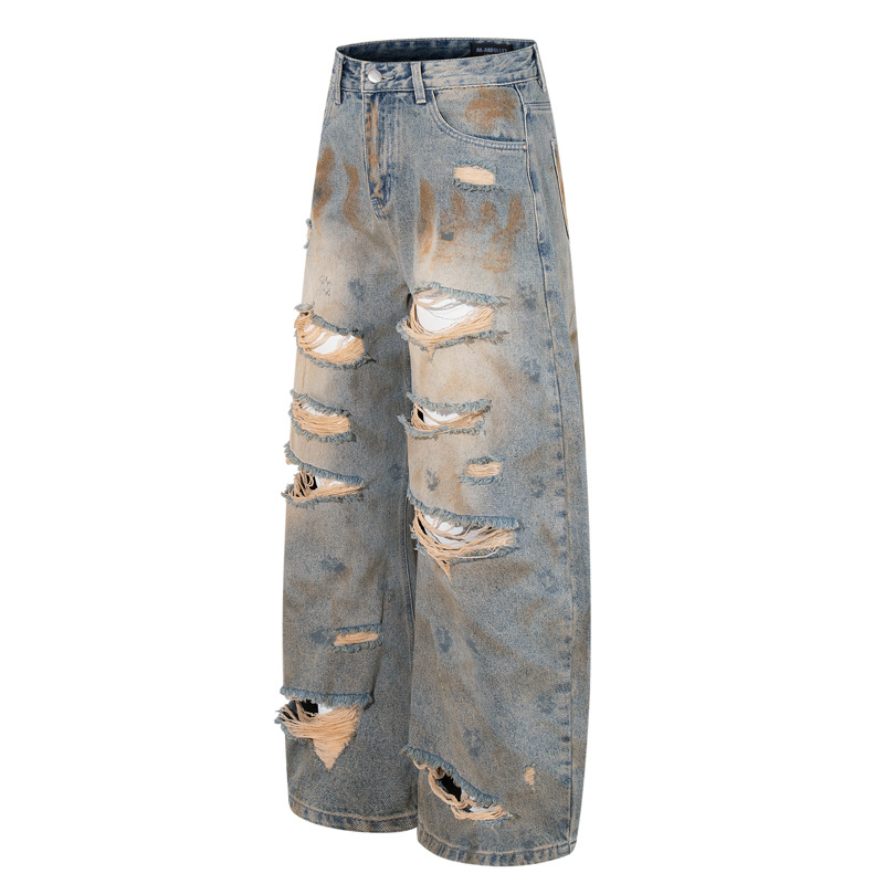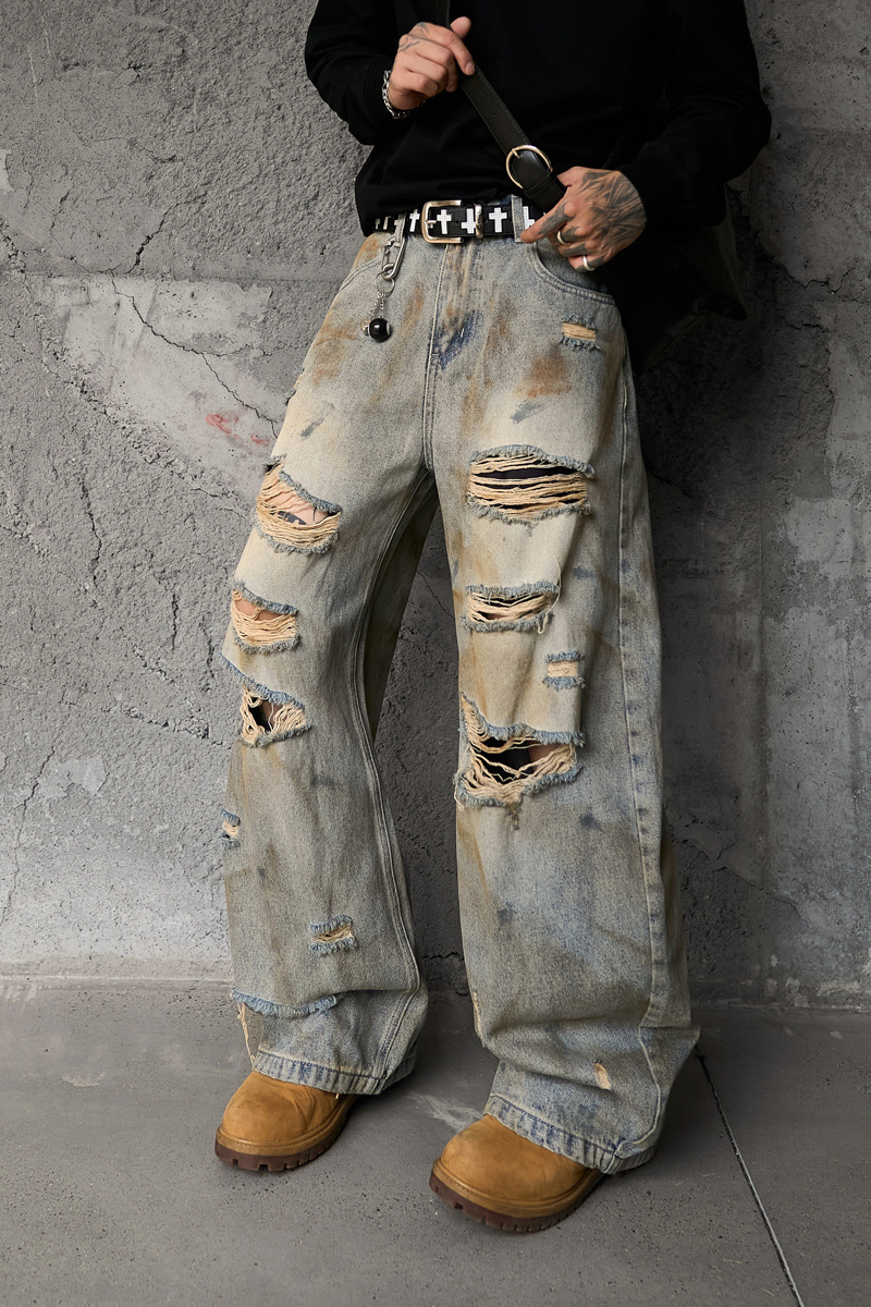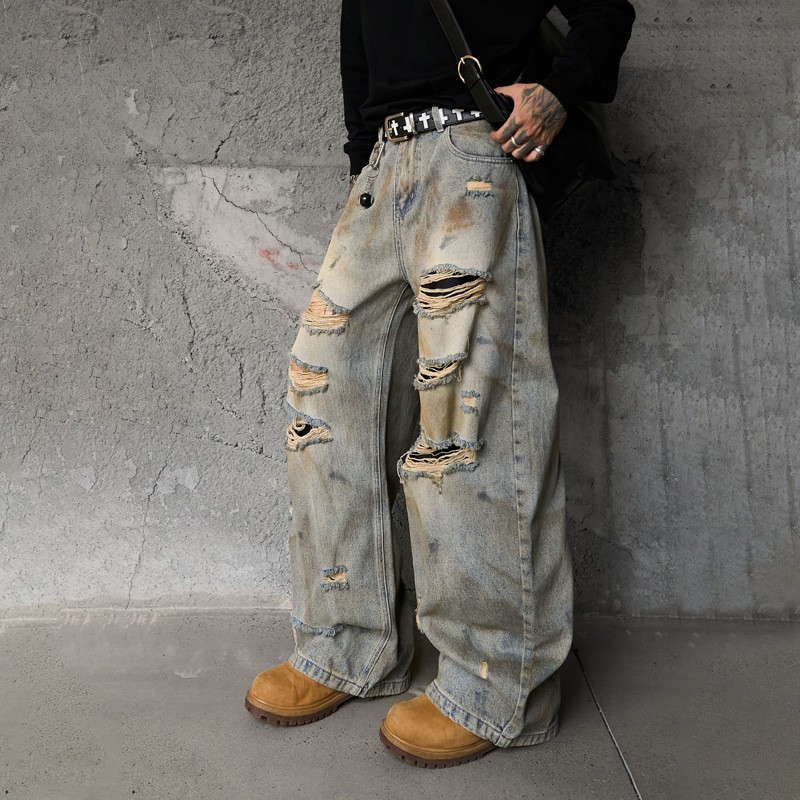 Style Casual Knife-Shape Pants Men Loose Straight Leg Distressed Autumn Fashion Vintage Ripped Jeans