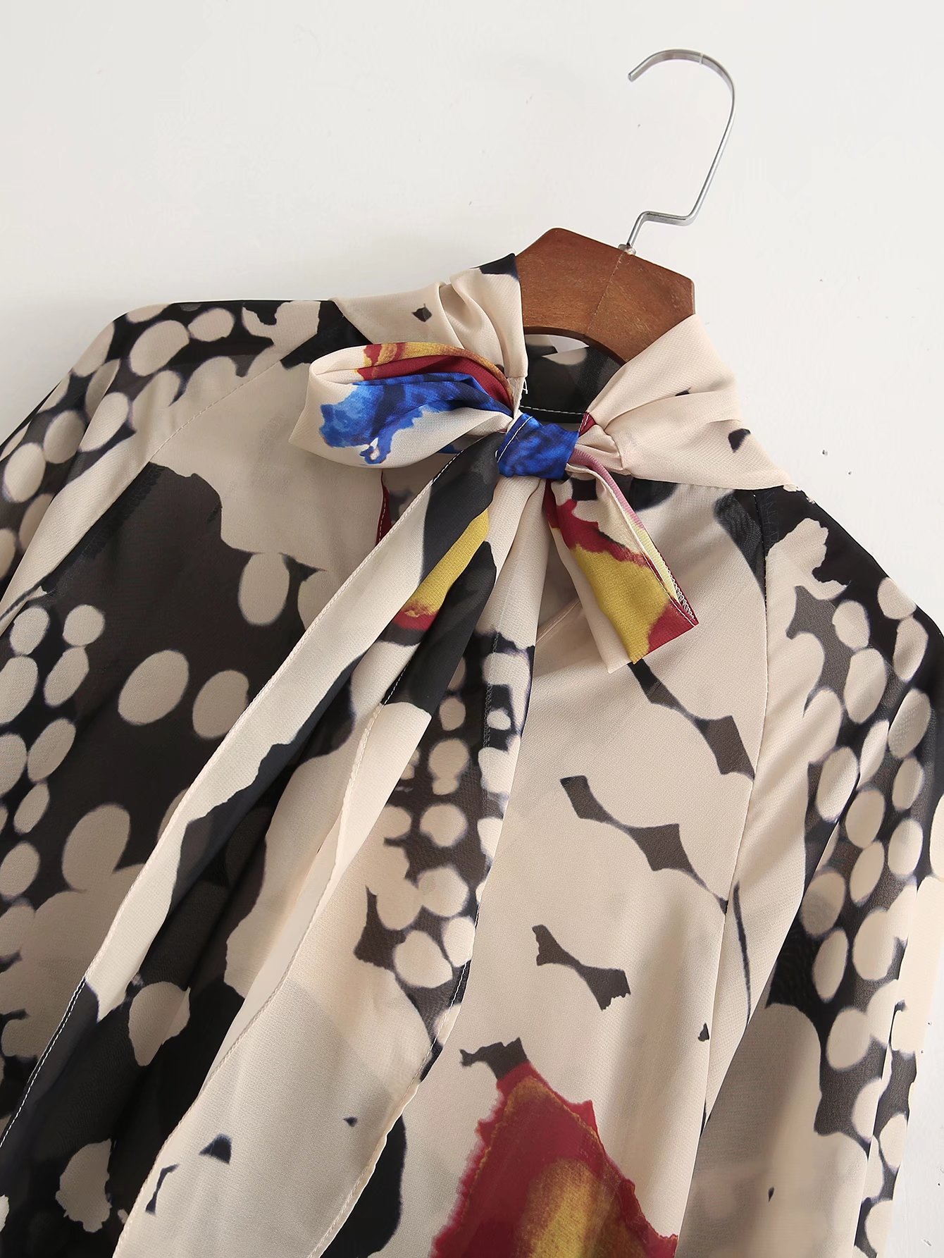 Women Fashion With Tied Bow Printed Loose Blouses Vintage Long Sleeve Asymmetric Female Shirts